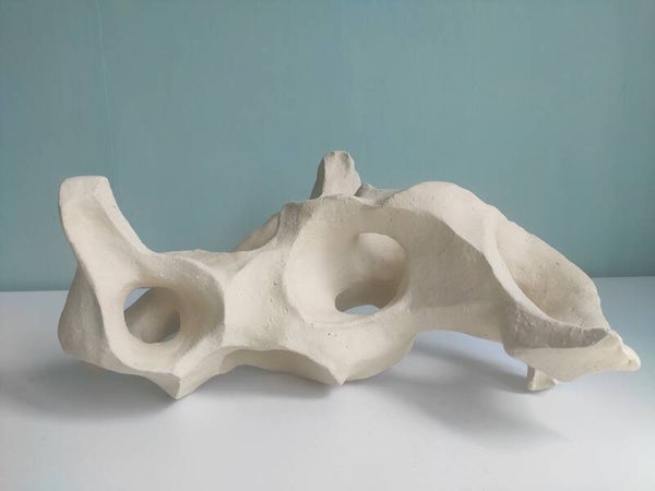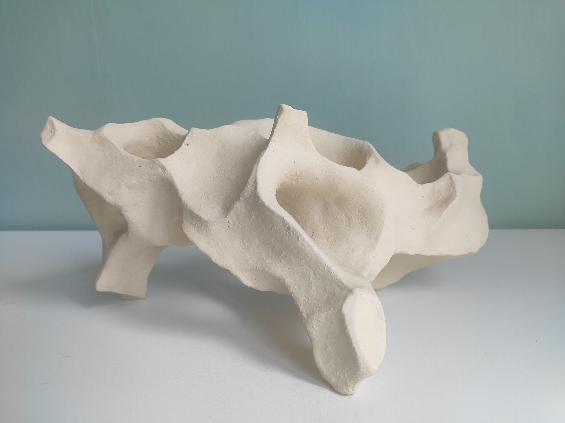Dit is het eerste werk uit de serie bones. Het is gemaakt van witte grove chamotte klei en gebakken op 1150 graden. Je kunt hem op verschillende manieren laten staan.